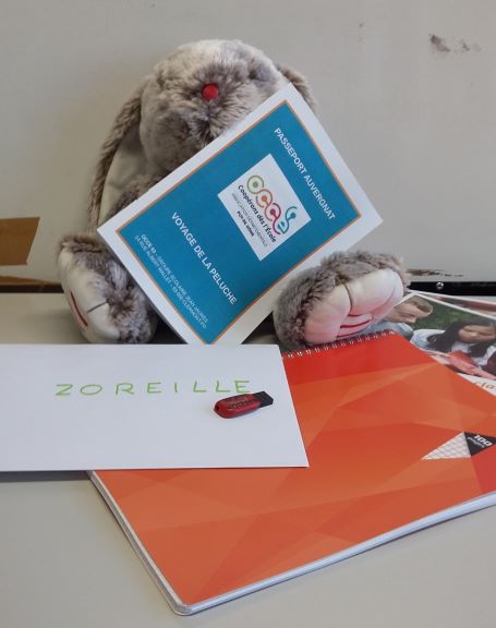 Matériel envoyé par l’OCCE ou récupéré en mains propres en début de projet – contenu du colis : peluche + carnet de voyage (cahier) + passeport de la peluche + clé USB + activités coopératives de l’Agenda Coop’ pour s’accueillir autrement, avec un livret pédagogique pour l’enseignant-e.